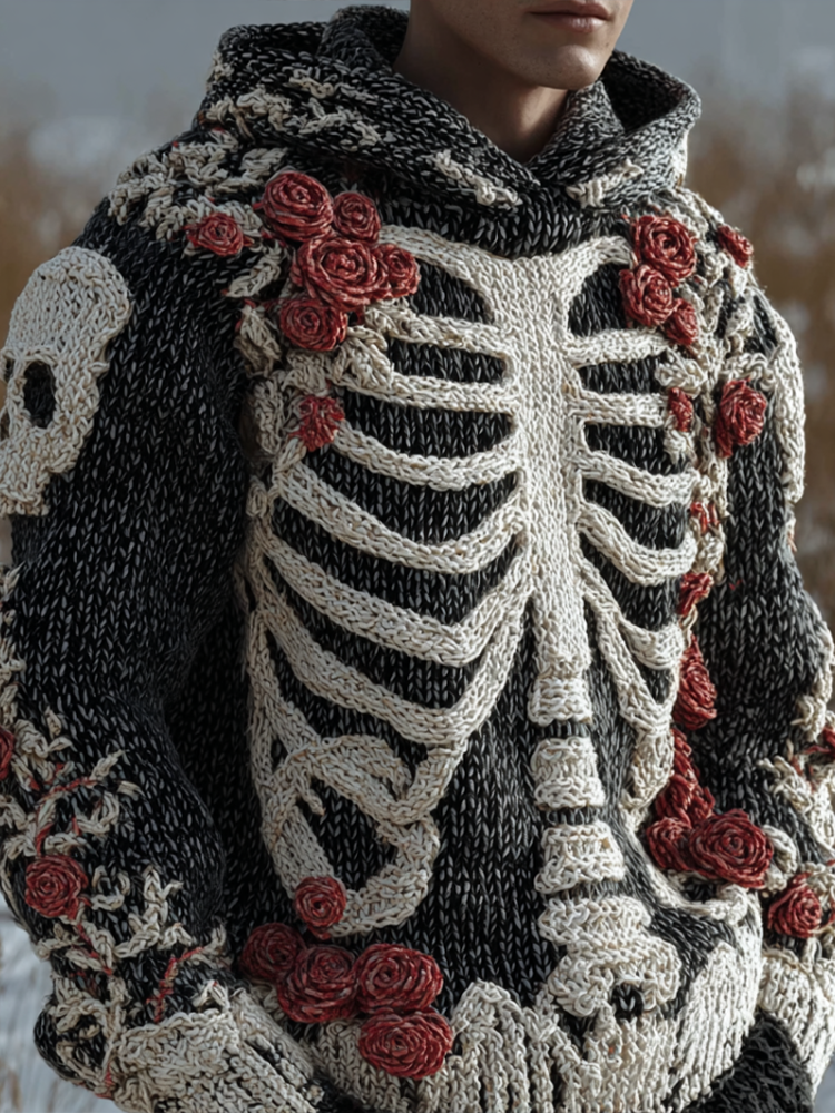 Halloween Human Anatomy Style Bone Pattern And Flower Pattern Combined Design Men's Hooded Knit Sweater