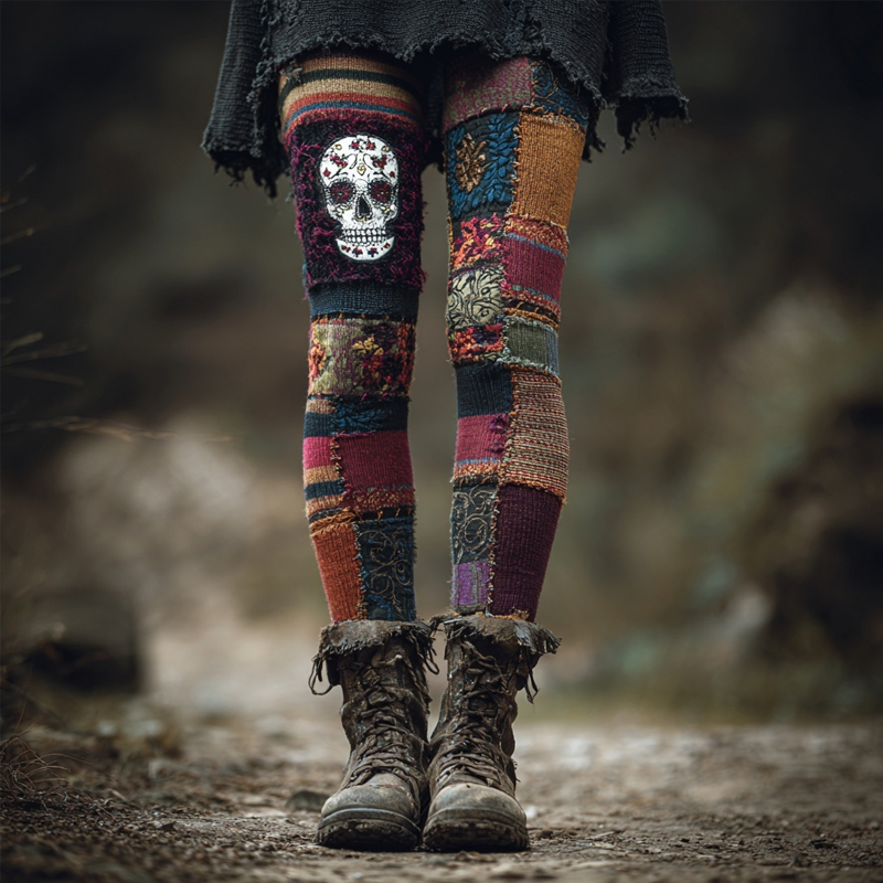 Halloween Skull Vintage Patchwork Cozy Knit Leggings