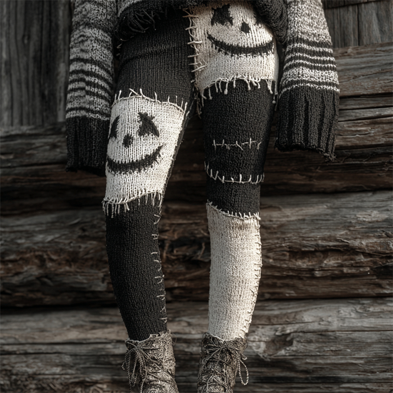 Halloween Stitched Face Contrast Patchwork Cozy Knit Leggings