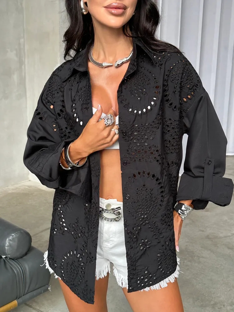 Ladies Lapel Hollowed Out Printed Casual Shirt