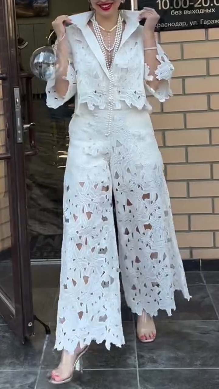 Ladies' Lapel Print Hollow Solid Color Casual Set