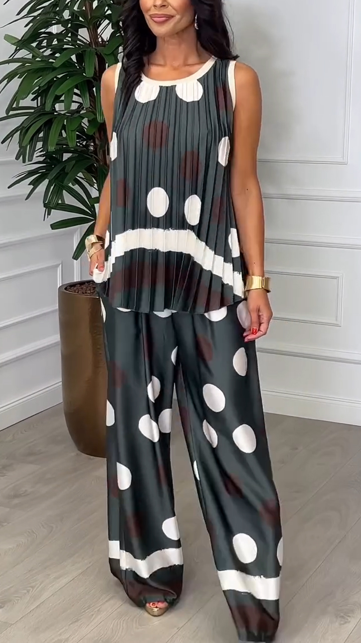 Ladies' Round Neck Polka Dot Pleated Top+ Pants Leisure Suit