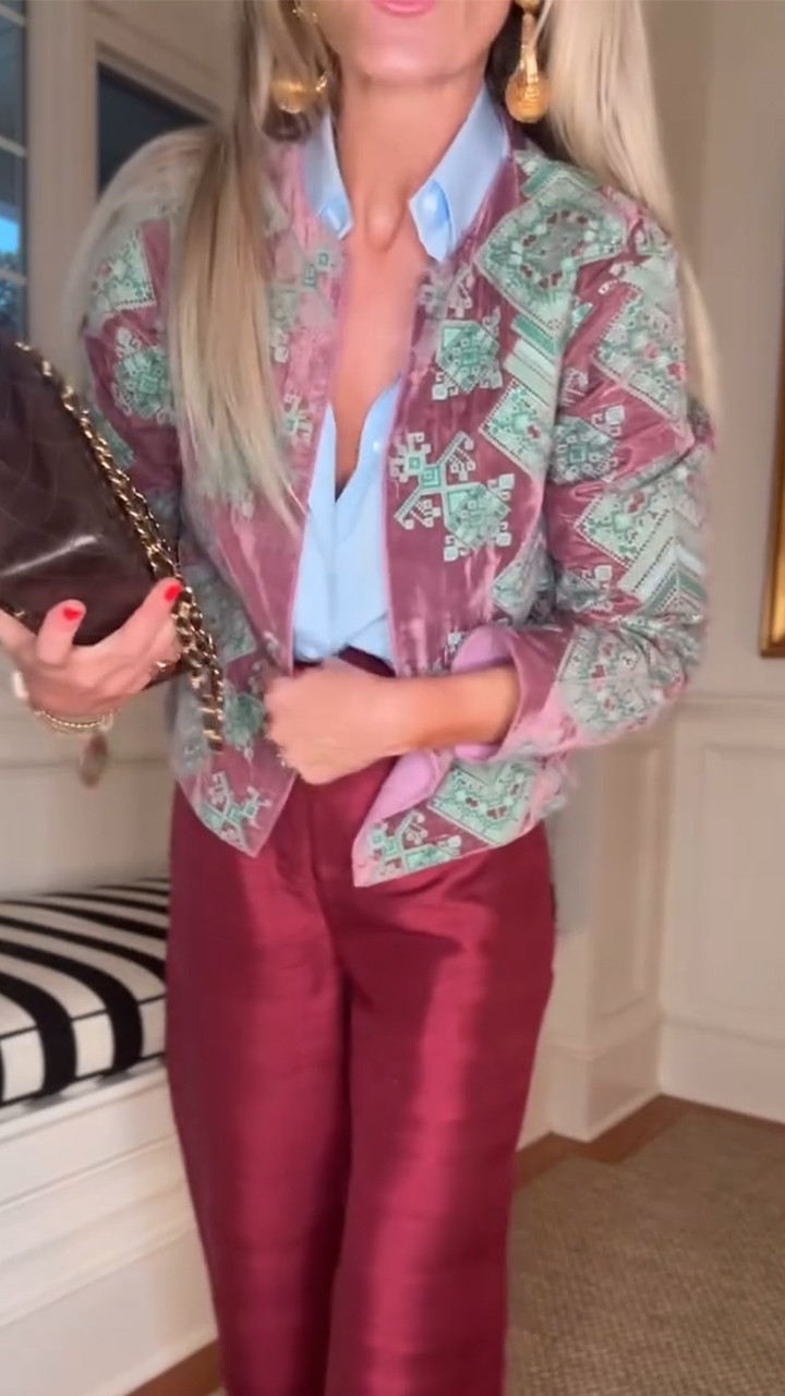 Ladies Round Neck Printed Casual Cardigan+ Solid Color Pants