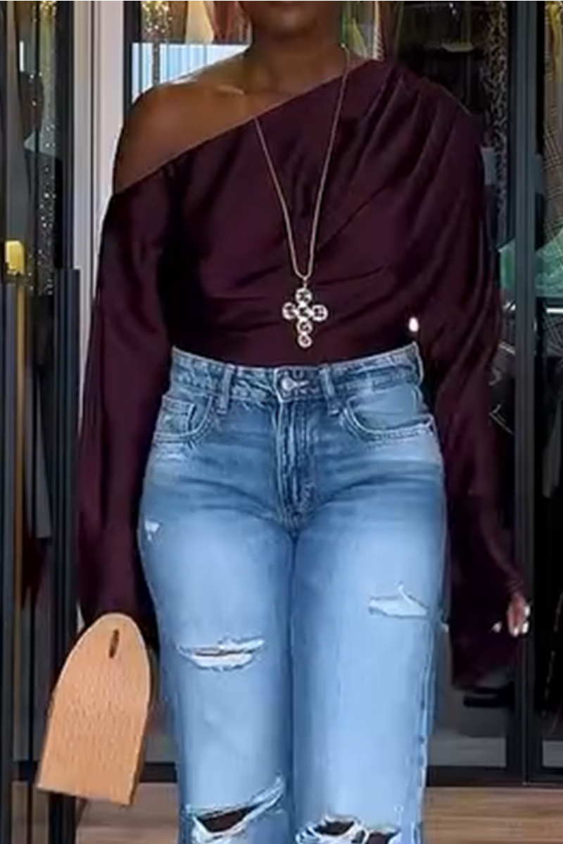 Ladies Slanted Collar Solid Color Temperament Casual Tops