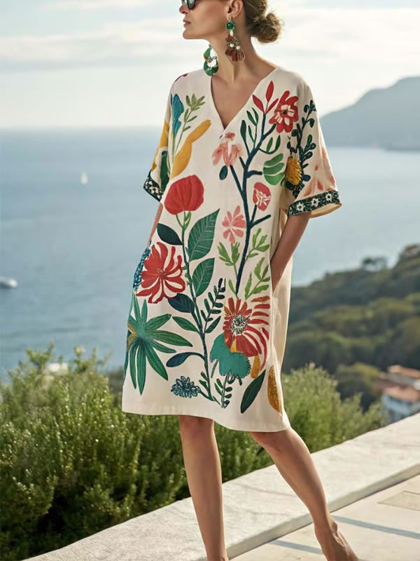 Ladies' V-neck Printed Casual Loose Fit Dress