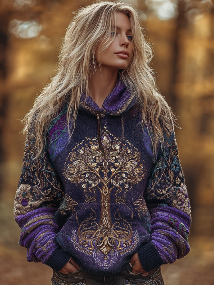 Viking Retro Life Tree Lady Hooded Thick Sweater
