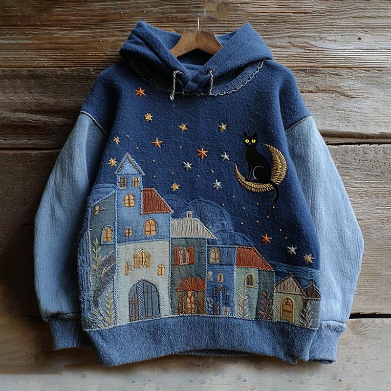 Vintage Fairytale Cottage With Lovely Cute Black Cat Inspired Embroidered Washed Hoodie