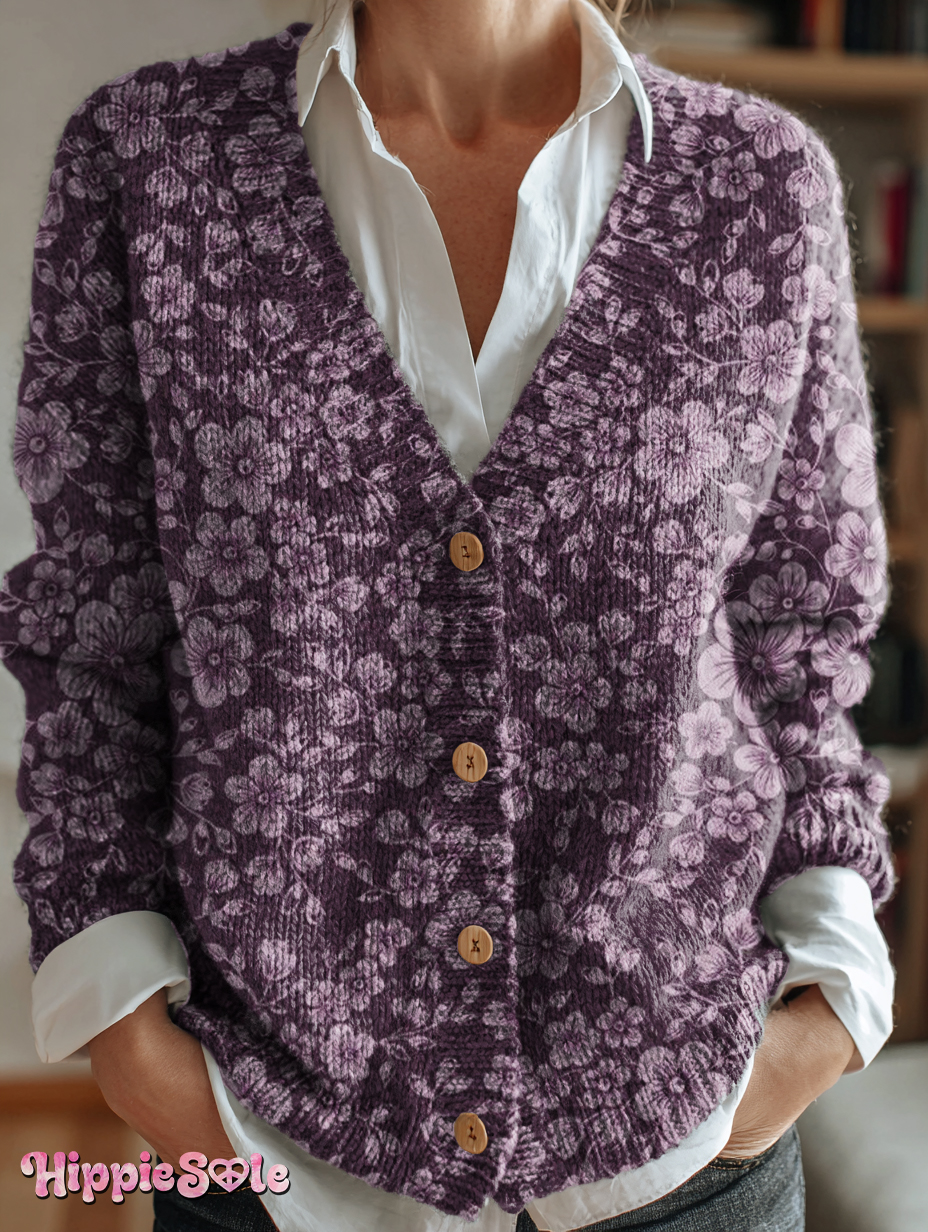 Vintage Floral Art Print Buttoned V-neck Cardigan Sweater