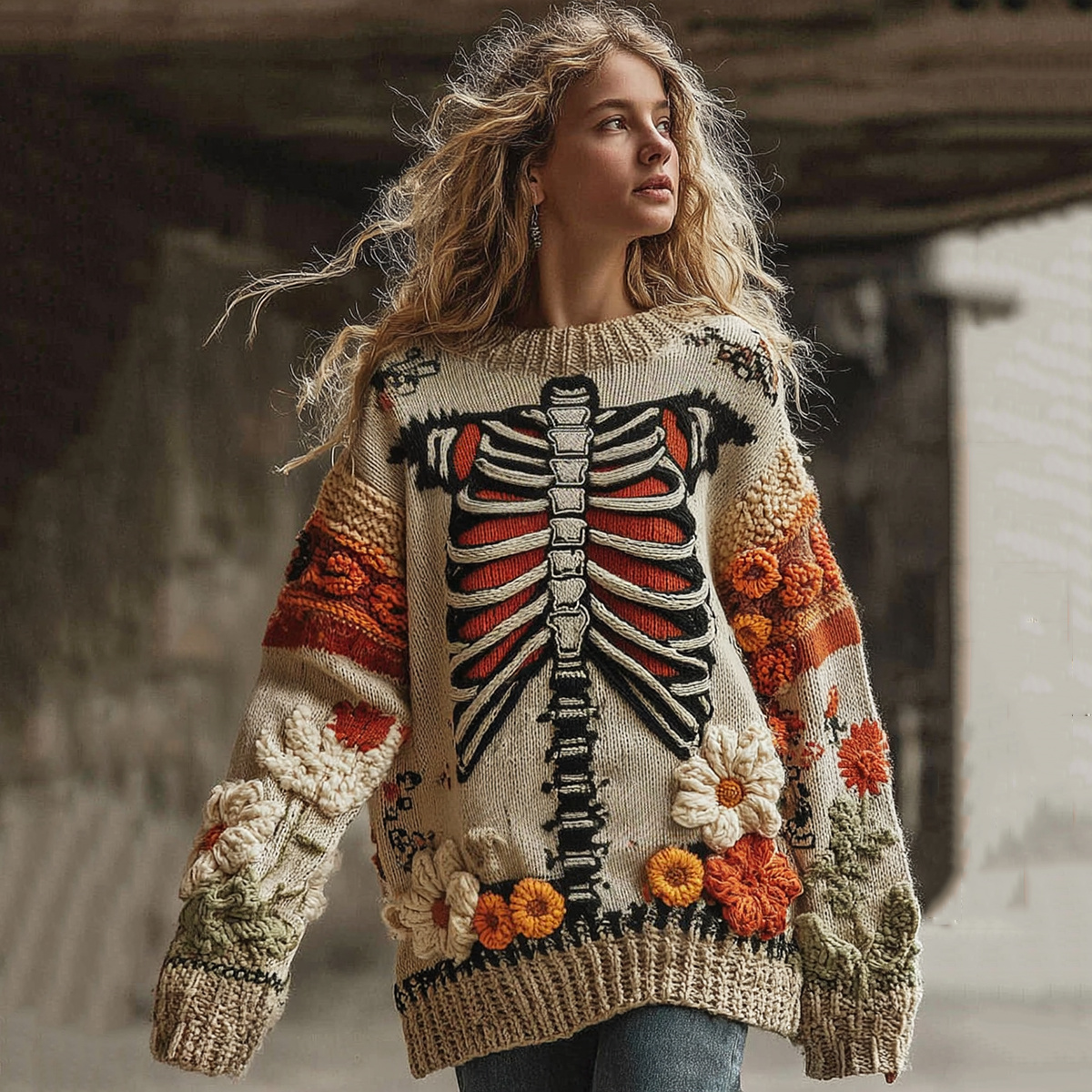Vintage Halloween Anatomy With Floral Art Chunky Knitted Sweater