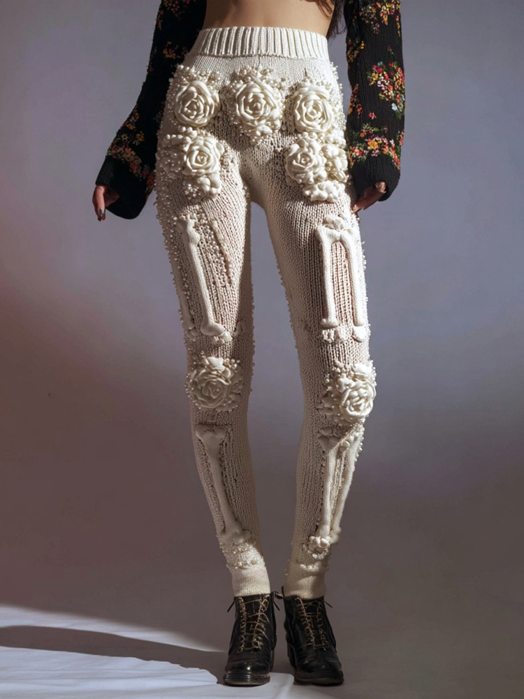 Vintage White Skeleton Roses Crochet Cozy Knit Leggings