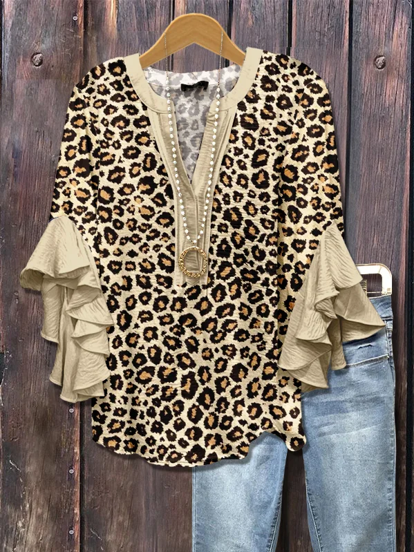 Women Leopard Half Sleeve Shirt Summer Printing V Neck Daily Casual Top