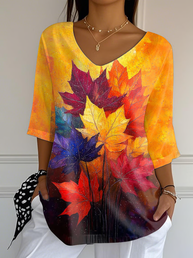 Women Maple Leaf Three Quarter Sleeve Tee T-shirt V Neck Printing Casual Spring/Fall Graphic Tee Top