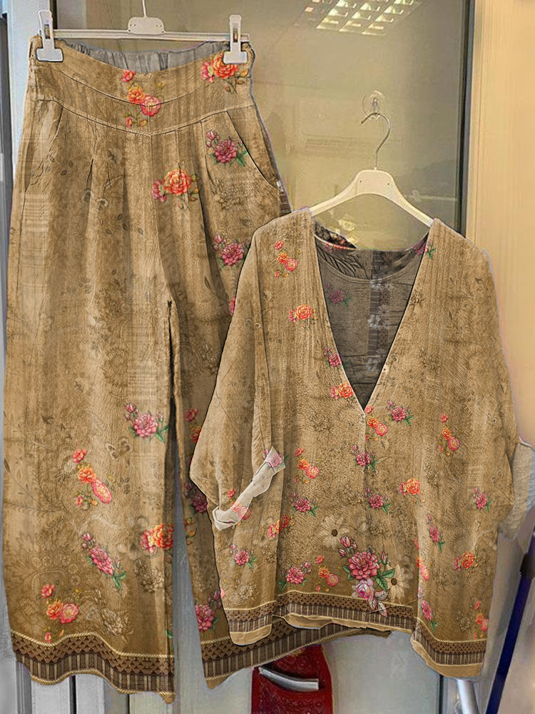 Women's Artistic Floral Ethnic Retro Printed Cotton and Linen Suit