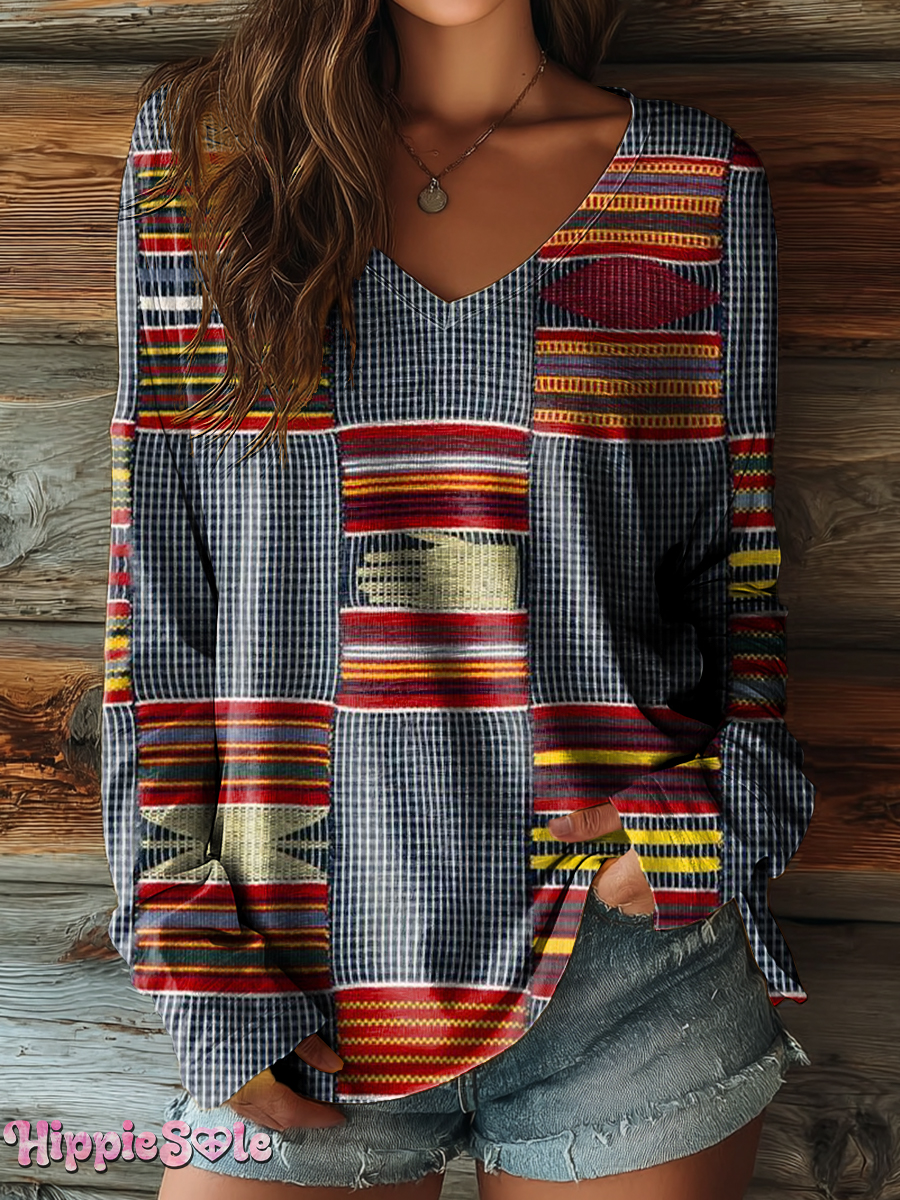 Women's Bohemian Pattern Art Print Casual V-neck Long Sleeve T-shirt
