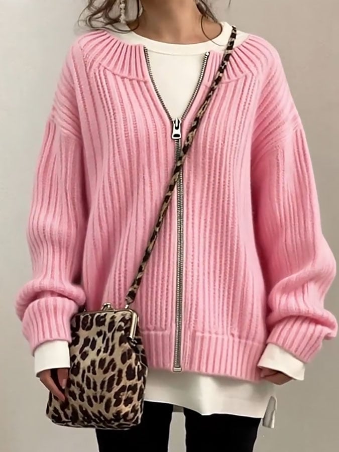 Women'S Casual Round Neck Solid Color Sweater Jacket