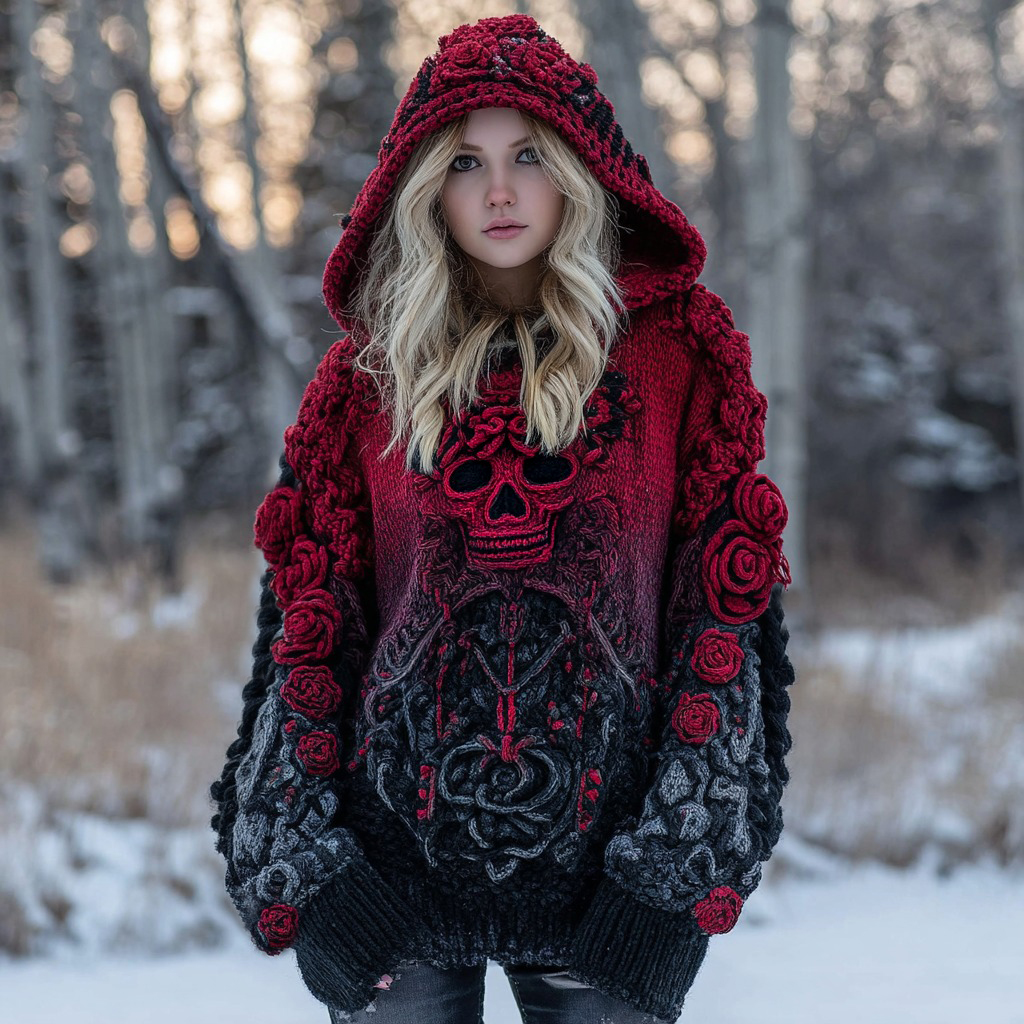 Women's Gothic Rose And Skull Inspired Jacquard Knit Hooded Sweater