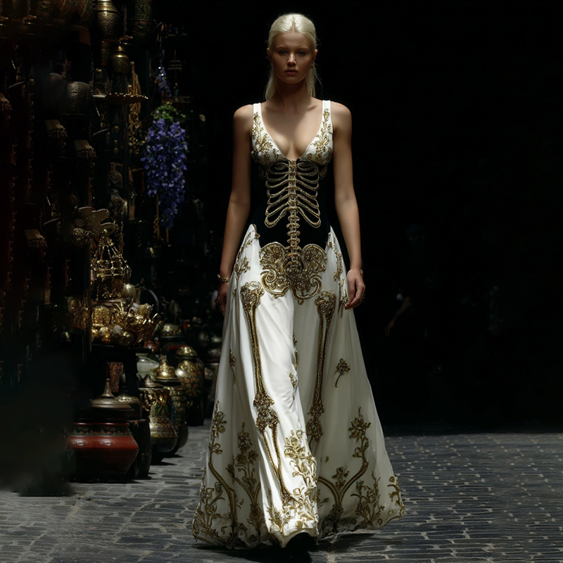Women's Halloween Skeleton Gothic Style V Neck Maxi Dress