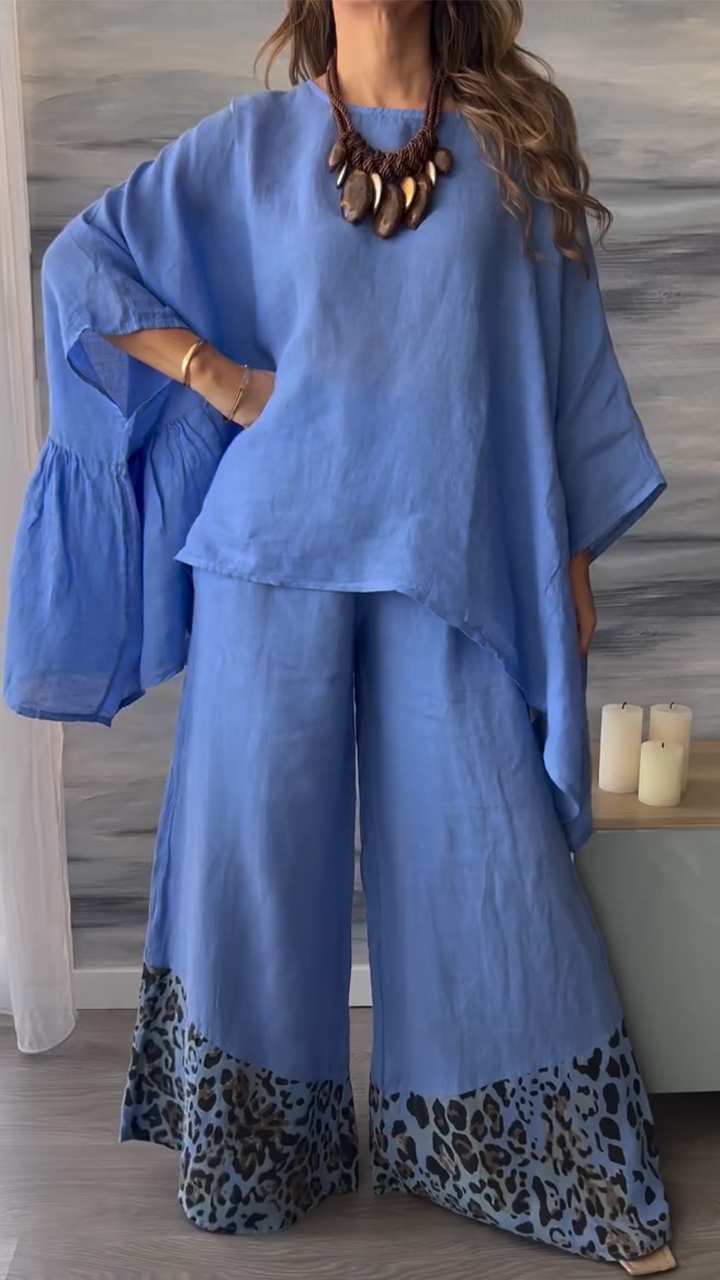 Womens Round Neck Irregular Top + Printed Pants Loose Casual Suit